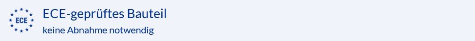 Auf tarox.eu kannst du die Zulassungform eines Artikels direkt auf einen Blick erkennen. In der Vorschau findest du die Zulassungsform als Icon oben rechts in der Ecke. ECE-genehmigte Artikel werden mit einem Kreis aus blauen Sternen und dem Text "ECE" in der mitte gekennzeichnet.